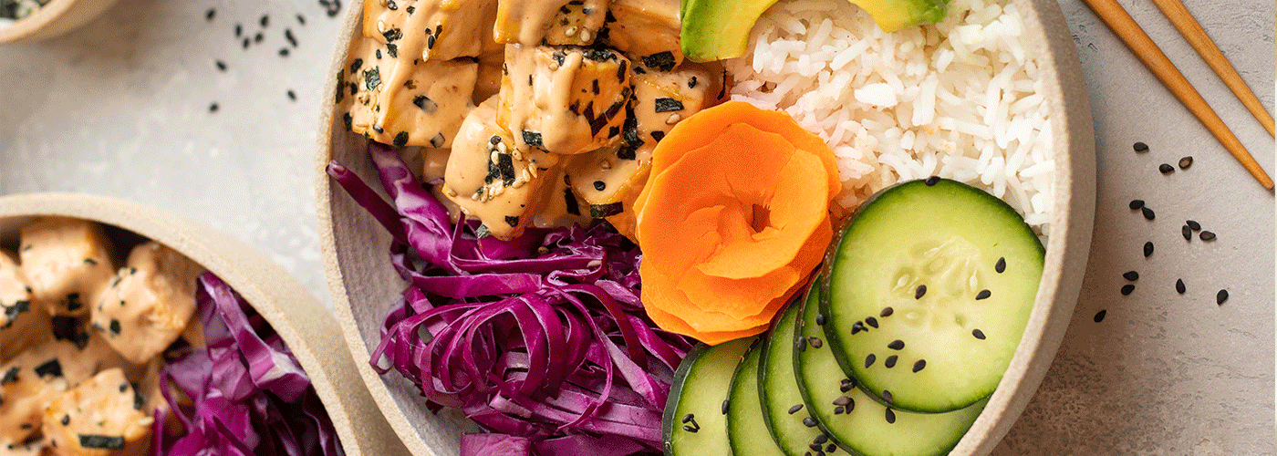 Assemble bowls: Divide rice among bowls. Top with chopped veggies and